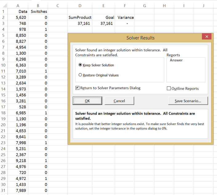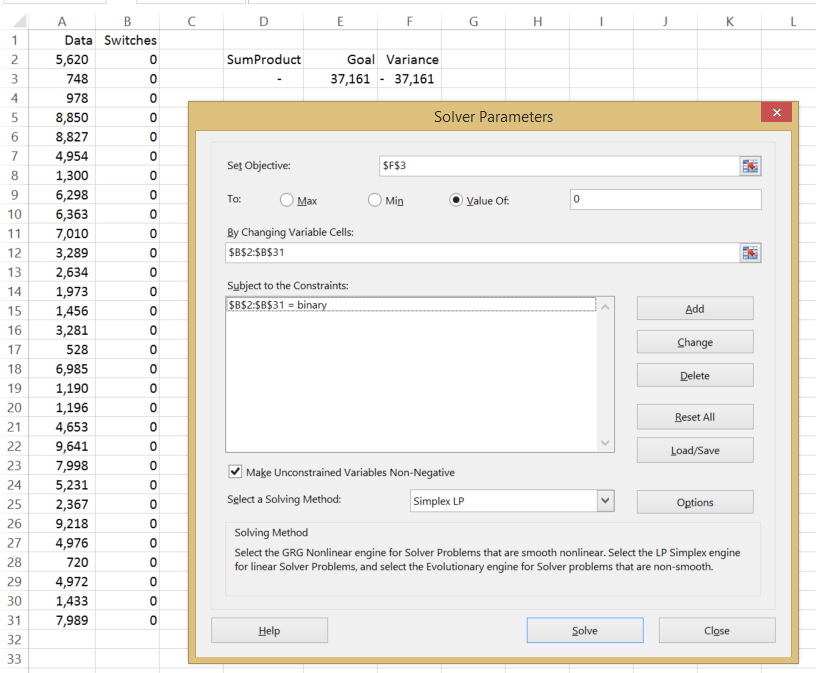 This Solver method works on ‘switching’ the appropriate zeros to ones. This will make more sense later but for now, just throw some zeros against each line of data.